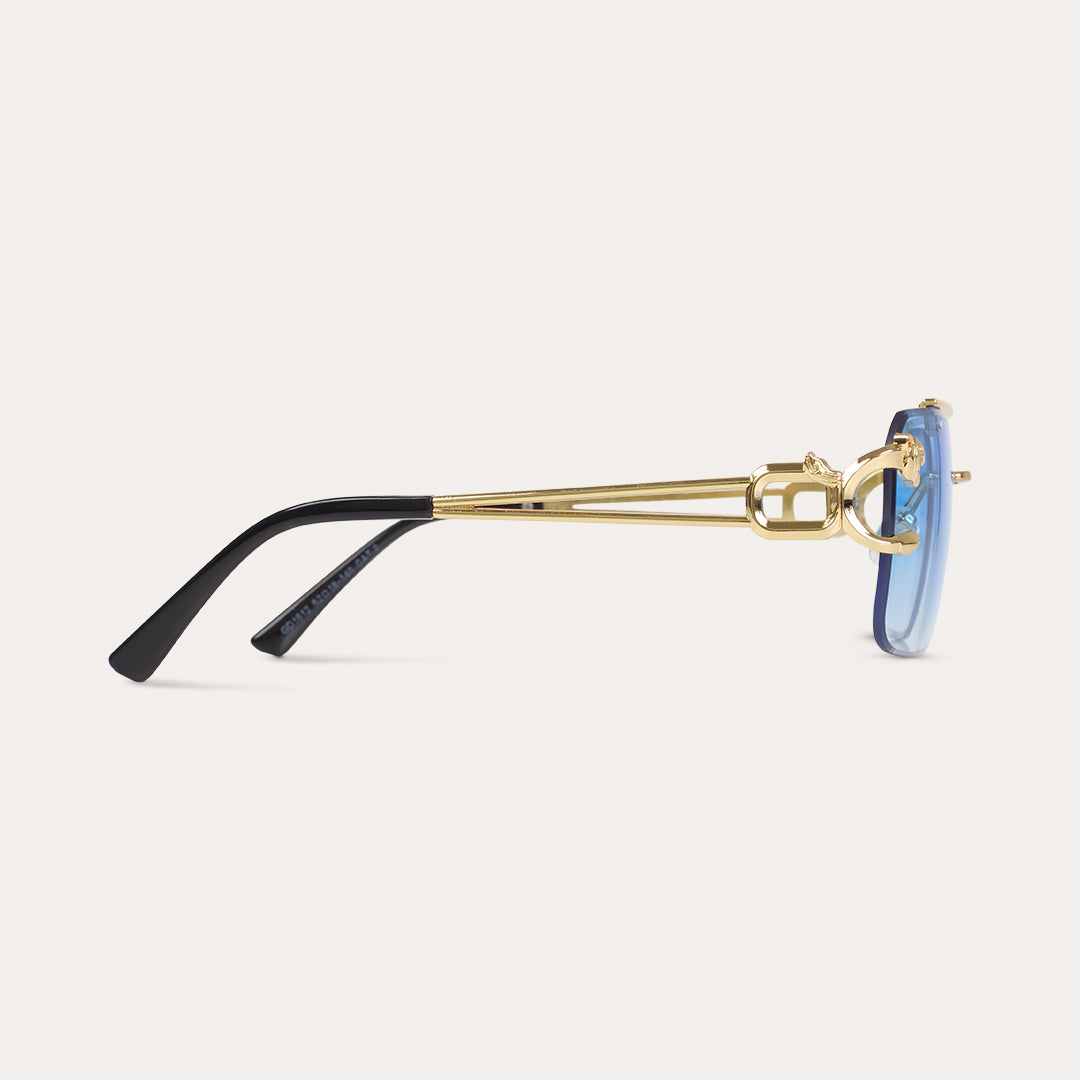 Su diseño sin montura y los detalles felinos dorados definen un estilo dominante, mientras las lentes gris degradadas aportan una profundidad enigmática.