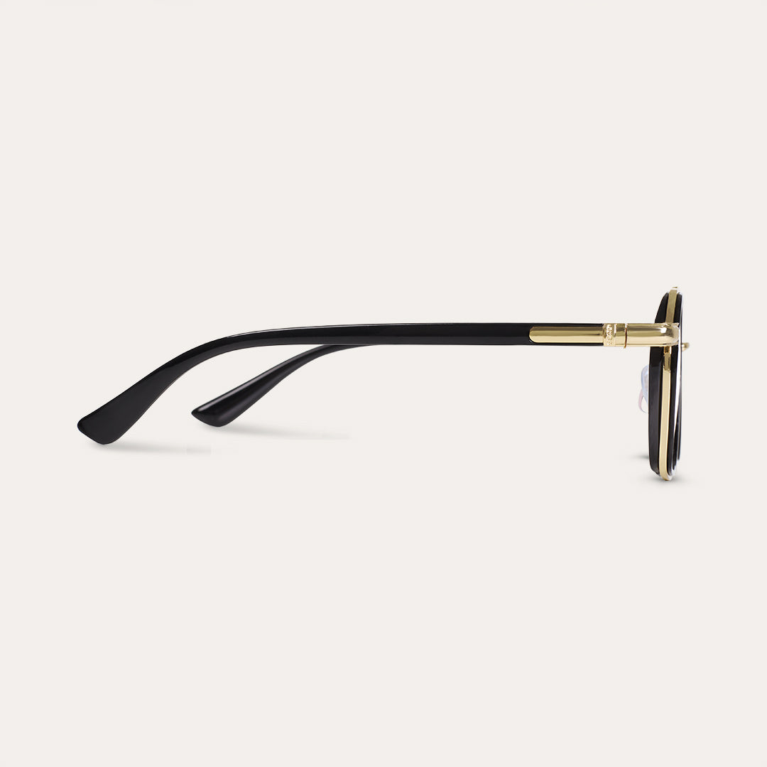 Montura dorada con lentes degradadas en rosa y azul. Una silueta contemporánea que captura el color del atardecer y la elegancia relajada.